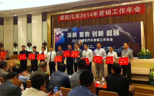 上午9時,會議正式開始。湖南獵豹汽車股份有限公司總經(jīng)理劉康林先生作為廠家領(lǐng)導(dǎo)代表致歡迎詞,獵豹汽車總經(jīng)理助理姚志輝先生對2013年工作總結(jié)及2014年的工作思路進行匯報!2013年優(yōu)秀經(jīng)銷商頒獎”環(huán)節(jié)中,慶陽唫菱汽車銷售服務(wù)有限公司榮登獵豹汽車光榮榜,榮獲“皮卡年度新秀獎”,同時獲得廠家獎勵獎金三萬元,慶陽唫菱王東經(jīng)理作為公司代表上臺領(lǐng)獎,獵豹汽車銷售部部長雷軍峰先生為其頒發(fā)了榮譽證書及獎金。