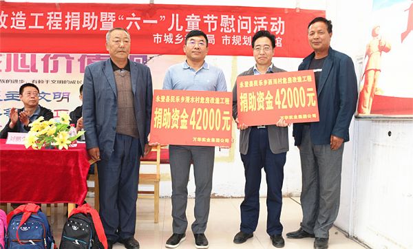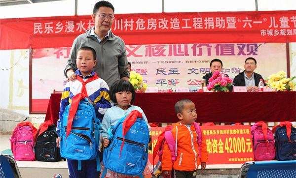 6月1日上午11時20分,民樂鄉(xiāng)漫水村、西川村危房改造工程捐助暨六一兒童節(jié)活動在永登縣民樂鄉(xiāng)漫水村村委會如期舉行。甘肅萬華實業(yè)集團有限公司向漫水村、西川村各捐助4.2萬元危房改造補助資金,蘭州市城鄉(xiāng)規(guī)劃局領(lǐng)導(dǎo)將嶄新的書包和學(xué)生用品送到當?shù)睾⒆觽兪种。蘭州市城鄉(xiāng)規(guī)劃局局長陳一夫、黨組書記楊正岱,蘭州市城鄉(xiāng)規(guī)劃局黨組成員、副局長盧健、楊正華、劉鵬堂,甘肅萬華實業(yè)集團有限公司董事長牛新民、副總經(jīng)理宿曉中,民樂鄉(xiāng)漫水村黨支部書記張成海,民樂鄉(xiāng)西川村黨支部書記楊天海等領(lǐng)導(dǎo)出席活動。