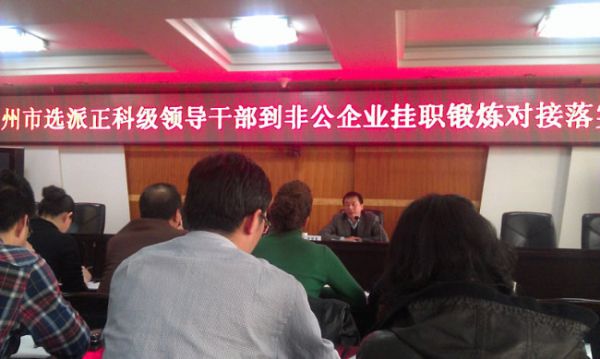 。ňC管中心 鄒秀芳)2013年3月6日下午15時(shí),蘭州市選派正科級(jí)領(lǐng)導(dǎo)干部到非公企業(yè)掛職鍛煉對(duì)接落實(shí)會(huì)議于蘭州市工商局召開(kāi)。蘭州市工商局黨組成員、紀(jì)檢組長(zhǎng)李繼軍主持會(huì)議,蘭州市非公辦主任王延紅出席會(huì)議。