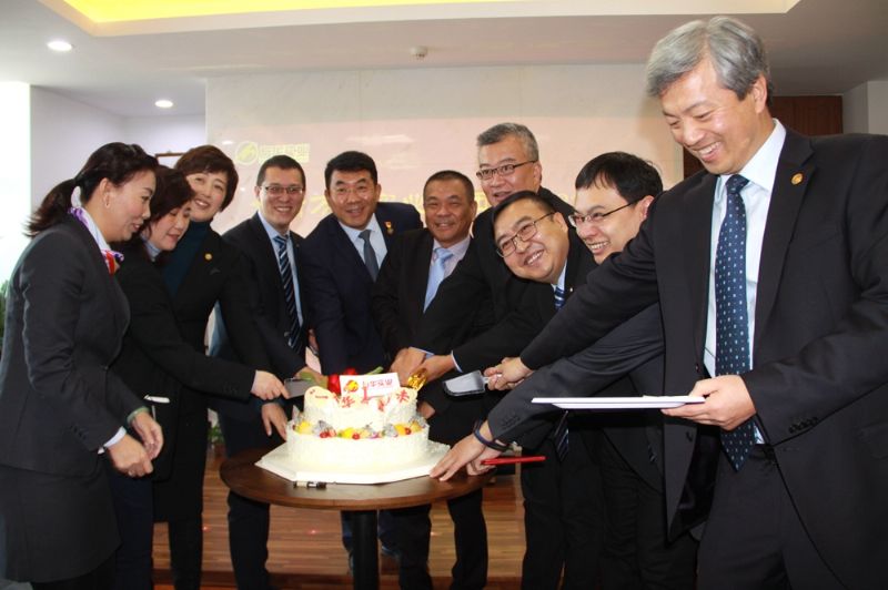 萬華金慧總經(jīng)理施強(qiáng),監(jiān)事會主席陳永華,董事會秘書王鑫,副總經(jīng)理張育民與新晉司齡5年和10年的老員工授勛合影,分享生日蛋糕共慶萬華21周年