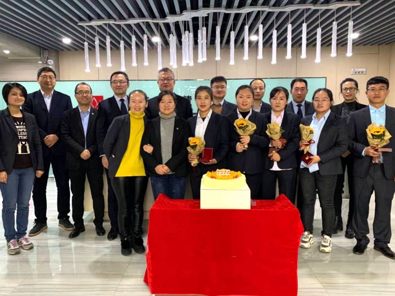 青海金易達(dá)總經(jīng)理丁云艷為司齡新晉5年和10年老員工佩戴金銀徽章,與全體員工共同送出對萬華21歲生日的祝福
