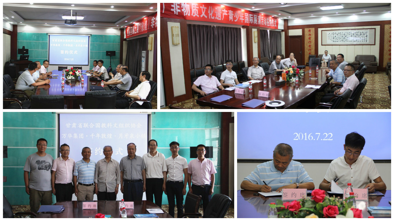 7月22日下午3時30分,甘肅省聯(lián)合國教科文組織協(xié)會杜永軍會長與甘肅萬華實業(yè)集團總經(jīng)理、敦煌千年古城開發(fā)有限公司董事長牛新偉,在萬華集團三樓會議室就“首屆絲綢之路(敦煌)非物質文化遺產(chǎn)青少年國際展演活動”合作事宜正式簽約。甘肅省人民政府原副秘書長、協(xié)會總顧問于忠正,甘肅省教育廳原副廳長、協(xié)會終身榮譽會長馬培芳等領導出席并見證了簽約儀式。