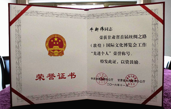 近日,首屆絲綢之路(敦煌)國際文化博覽會總結(jié)表彰大會在敦煌大劇院召開。會議表彰了首屆文博會工作中敦煌市涌現(xiàn)出來的50個先進集體、160名先進個人,以及1300多名群防群治工作先進個人。敦煌千年古城開發(fā)有限公司董事長牛新偉榮獲“先進個人”榮譽稱號。