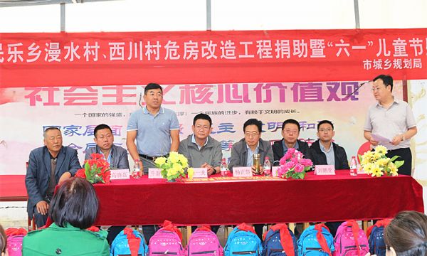 6月1日上午11時20分,民樂鄉(xiāng)漫水村、西川村危房改造工程捐助暨六一兒童節(jié)活動在永登縣民樂鄉(xiāng)漫水村村委會如期舉行。甘肅萬華實業(yè)集團有限公司向漫水村、西川村各捐助4.2萬元危房改造補助資金,蘭州市城鄉(xiāng)規(guī)劃局領(lǐng)導(dǎo)將嶄新的書包和學(xué)生用品送到當?shù)睾⒆觽兪种。蘭州市城鄉(xiāng)規(guī)劃局局長陳一夫、黨組書記楊正岱,蘭州市城鄉(xiāng)規(guī)劃局黨組成員、副局長盧健、楊正華、劉鵬堂,甘肅萬華實業(yè)集團有限公司董事長牛新民、副總經(jīng)理宿曉中,民樂鄉(xiāng)漫水村黨支部書記張成海,民樂鄉(xiāng)西川村黨支部書記楊天海等領(lǐng)導(dǎo)出席活動。