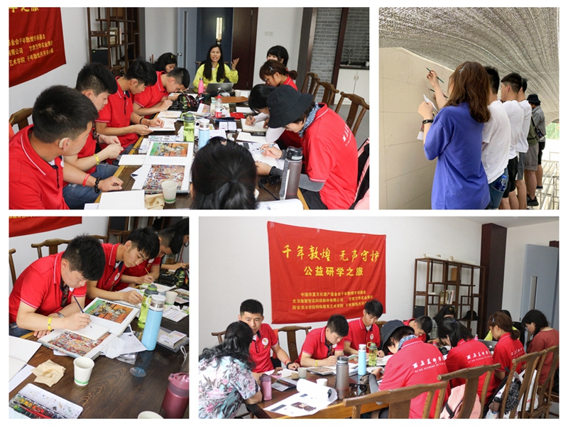 上午9時(shí),學(xué)員們?cè)缭鐏?lái)到月牙泉小鎮(zhèn)鳴沙書(shū)院內(nèi),根據(jù)22日參觀(guān)學(xué)習(xí)莫高窟壁畫(huà)所整理的資料,用手語(yǔ)探討交流,并展開(kāi)初步構(gòu)思。在西美老師的細(xì)心指導(dǎo)下,他們很快沉醉在美妙的藝術(shù)世界里。