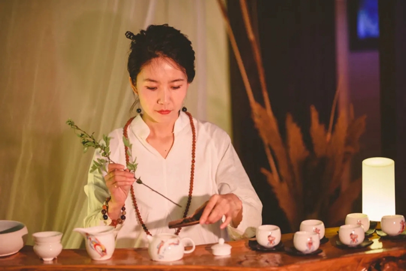 放下一切,遠(yuǎn)離喧囂,不問雜事。爐中升起的裊裊細(xì)香,與懸壺高沖激起的茶煙相結(jié)合。瞬間,月牙泉小鎮(zhèn)議堂內(nèi)盈溢著沉香與茶香,沁人心脾……