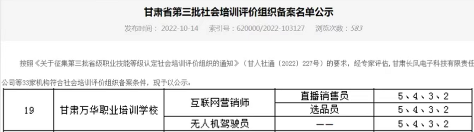 10月17日,甘肅萬華職業(yè)培訓學校順利通過甘肅省人力資源與社會保障廳“甘肅省第三批社會培訓評價組織備案”,獲得“互聯(lián)網(wǎng)營銷師”“無人機駕駛員”兩個工種的職業(yè)技能考評資格。